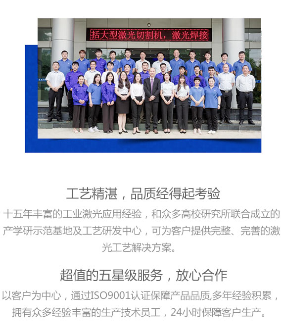 - 十五年豐富的工業(yè)激光應用經驗,和眾多高校研究所聯合成立的產學研示范基地及工藝研發(fā)中心,可為客戶提供完整、完善的激光工藝解決方案。